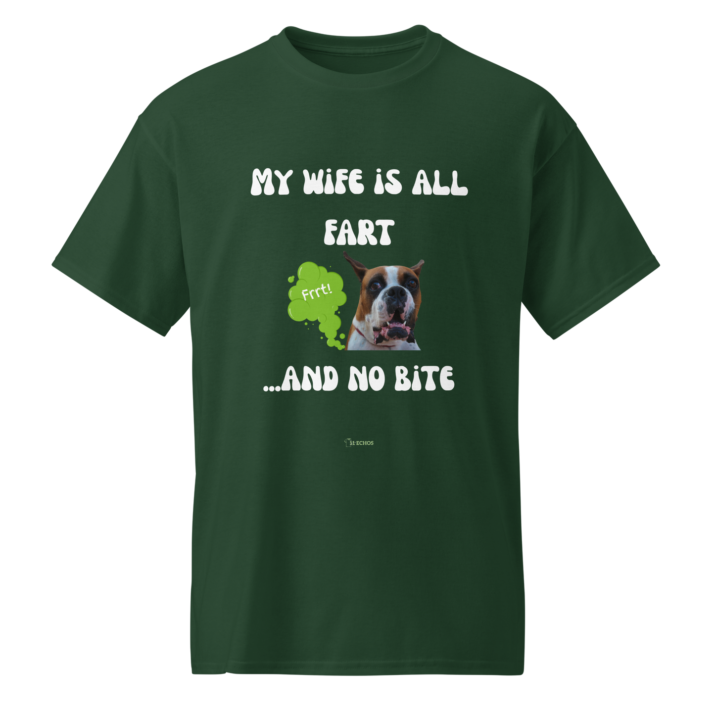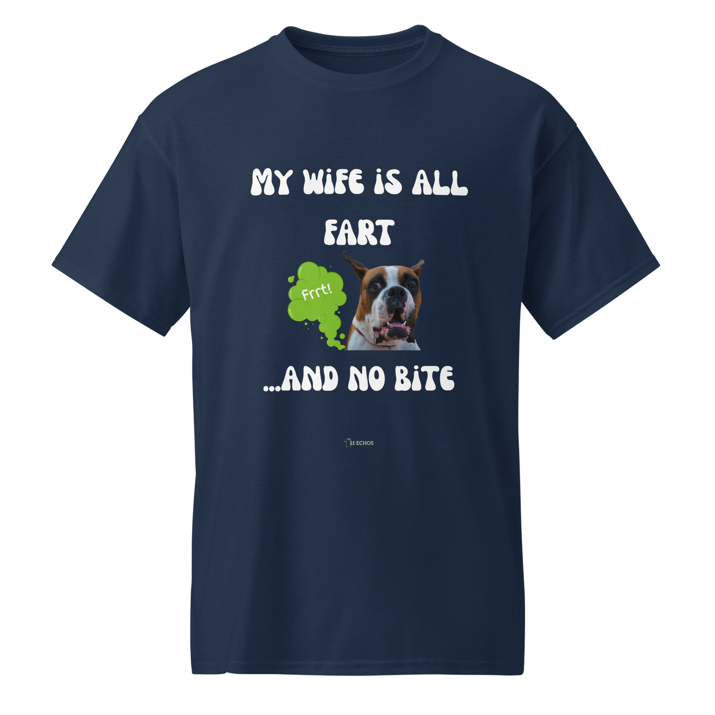 Love stinks… literally. Our “My wife is all fart...and no bite” tee is a soft, comfy tribute to the joys of marriage and the occasional airborne surprise. Perfect for husbands who like to keep things light, funny, and just a little cheeky. Whether you're running errands or just dodging gas attacks on the couch, this shirt says, “I married my best friend — and her digestive system.” Wear with caution (and maybe crack a window).