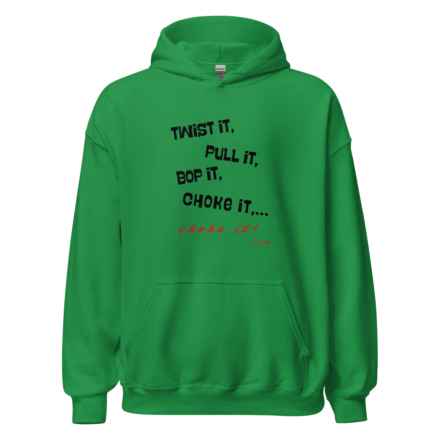 Remember Bop It! from the good old days? Well, we gave it an adult upgrade. Our “Bop It! Choke It.” hoodie is packed with that twisted adult humor you know and love, turning childhood nostalgia into a hilarious, slightly inappropriate conversation starter. This funny hoodie is perfect for parties, gag gifts, or just making people do a double take. If you're into apparel that push buttons (just like the toy), this one's a must-have.