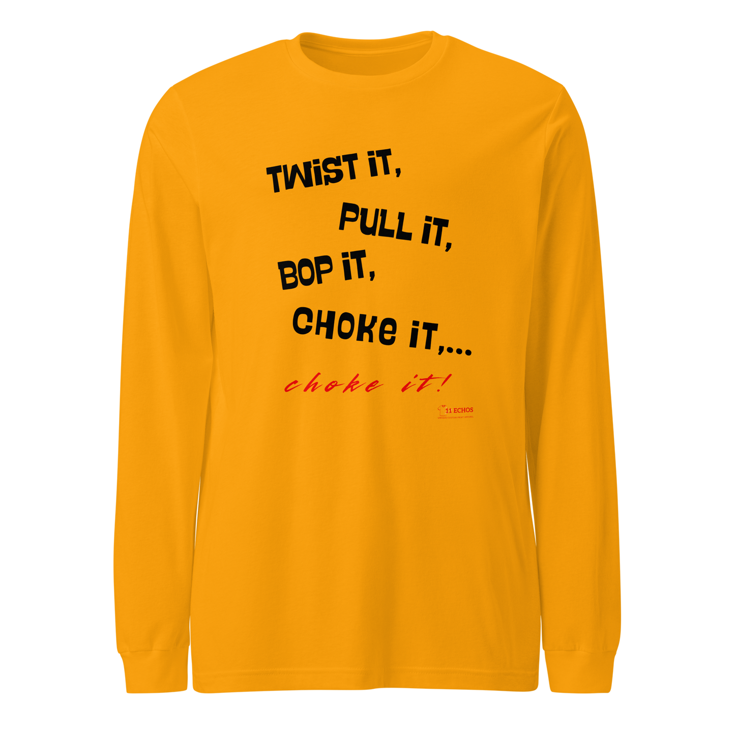 Remember Bop It! from the good old days? Well, we gave it an adult upgrade. Our “Bop It! Choke It.” long sleeve tee is packed with that twisted adult humor you know and love, turning childhood nostalgia into a hilarious, slightly inappropriate conversation starter. This funny shirt is perfect for parties, gag gifts, or just making people do a double take. If you're into shirts that push buttons (just like the toy), this one's a must-have.