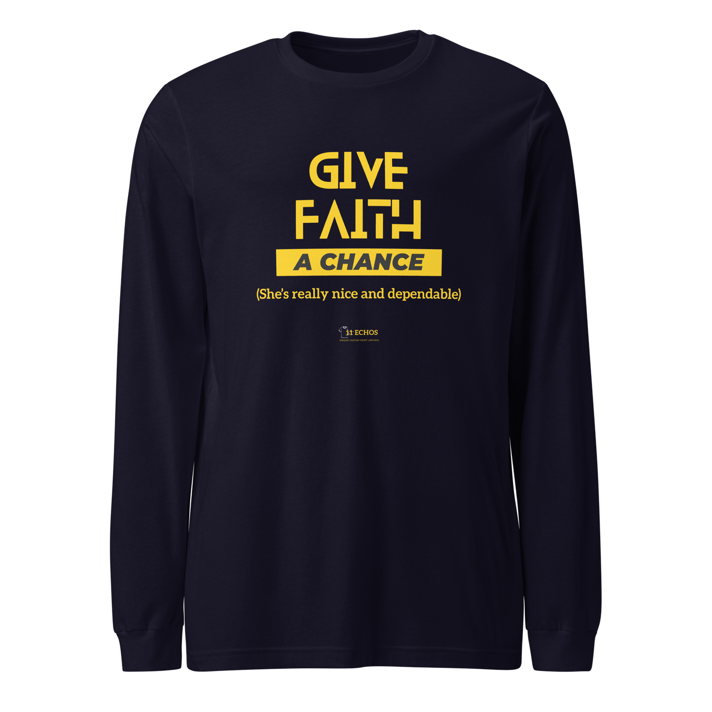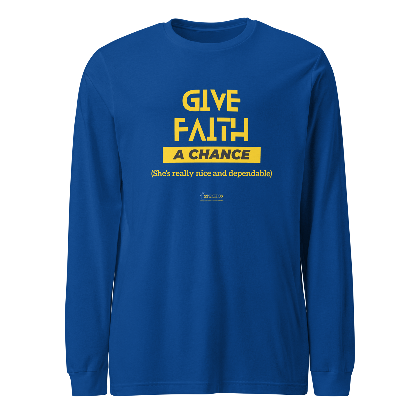 Sometimes, all you need is a little faith—and we’re not just talking about the concept. Our “Give Faith a Chance” long sleeve shirt adds a hilarious twist with the tagline: (She’s really nice and dependable). Whether you're a believer in good vibes, divine timing, or just love a clever pun, this shirt is your new go-to. It’s perfect for spreading laughs, light, and just a touch of inspiration. Wear it proudly and let the world know: faith isn’t just a virtue—it’s a total gem.
