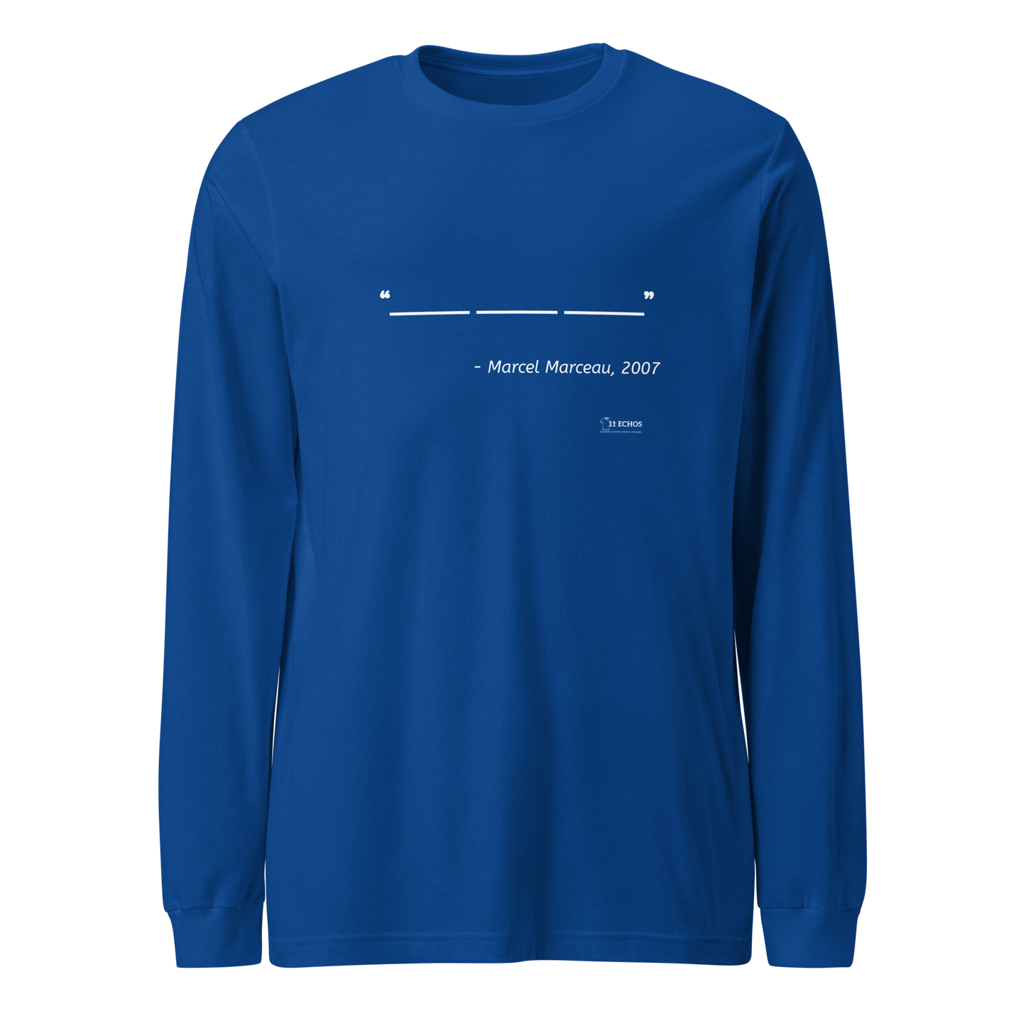 Perfect for cool weather and colder personalities, this long sleeve tee pays tribute to the art of saying nothing—but looking amazing while doing it. With Marcel Marceau’s eternally mute quote “_____ _____ _____” front and center, it's ideal for the strong, silent type (or the petty, quiet type—no judgment). Wear it when words fail, or when people really just don’t deserve your commentary. Silence has never looked so smug.