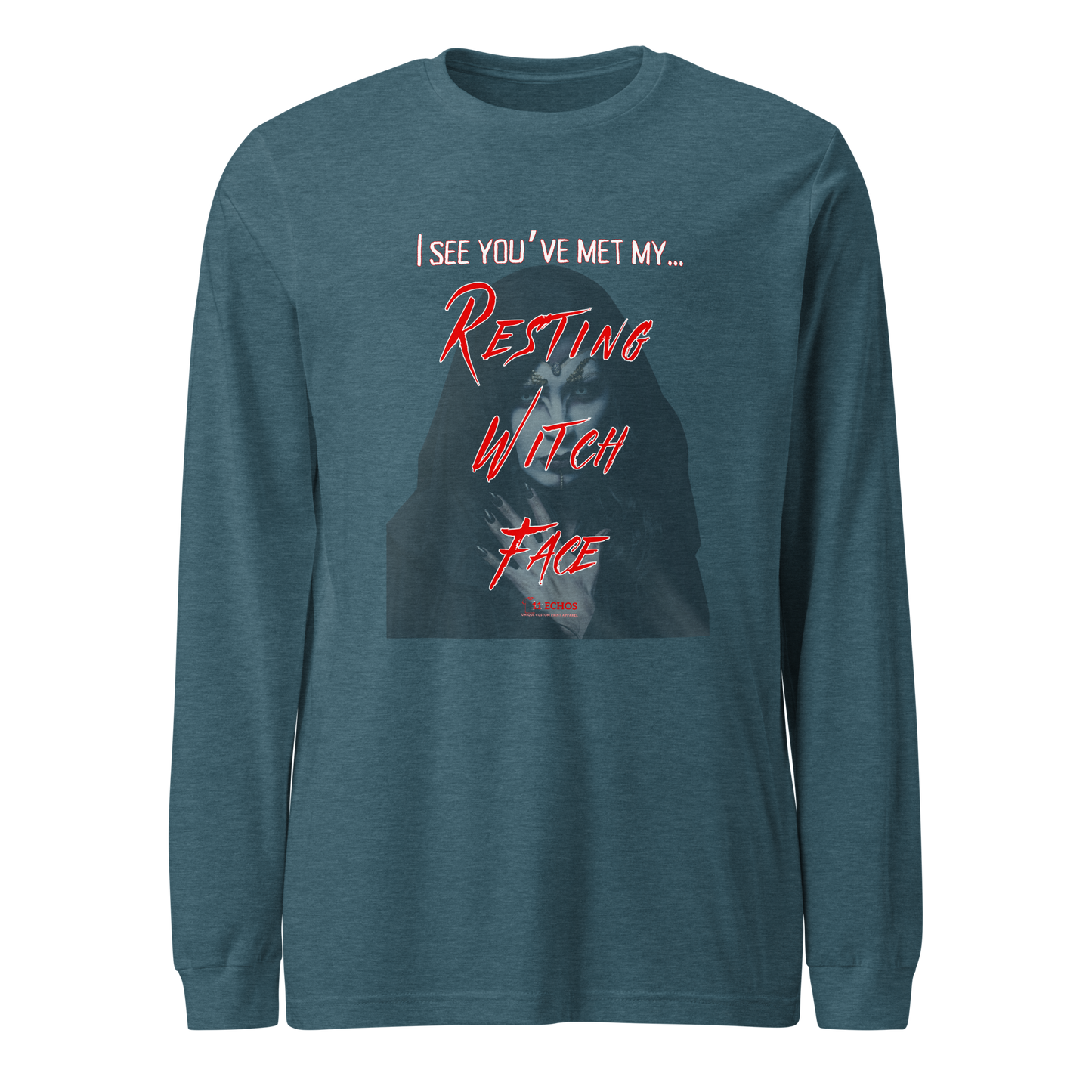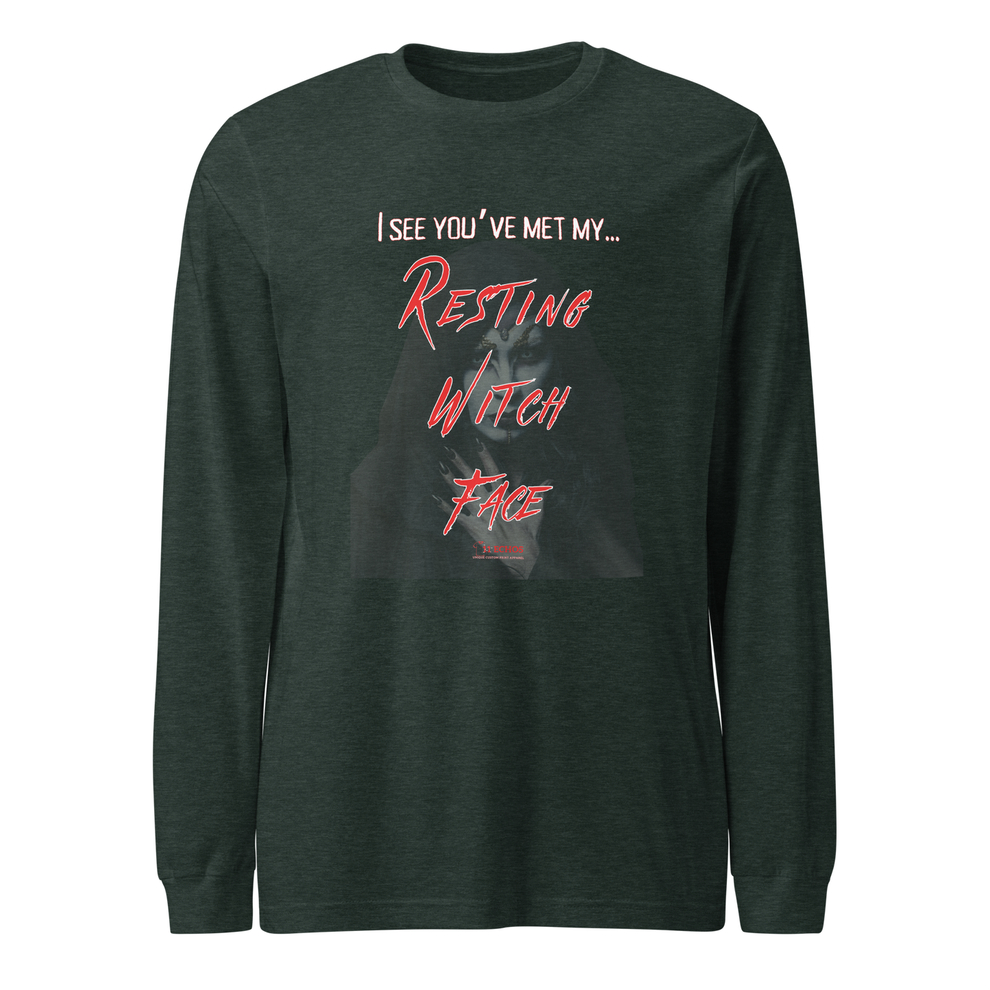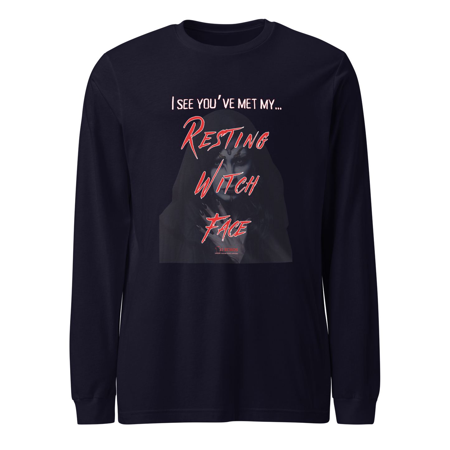Tired of people telling you to smile? Channel your inner '90s goth and Halloween queen with our Resting Witch Face long sleeve t-shirt — the perfect blend of spooky sass and vintage sarcasm. Made for Gen X souls who still blast "Monster Mash" on cassette and remember when witches were cool before streaming. Soft, comfy, and cut with just the right amount of deadpan, this tee will have everyone spellbound (or slightly afraid to talk to you — win-win). Rock it at the pumpkin patch, haunted house, or just while ghosting people.
