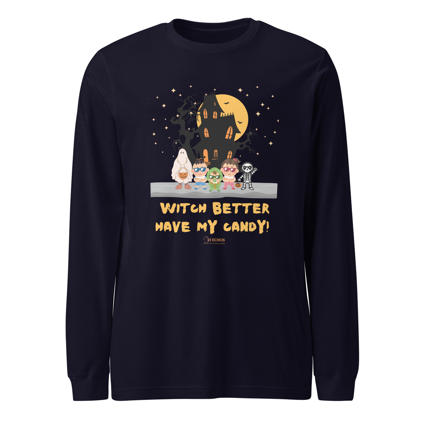 Because grown-up trick-or-treating is a whole mood. Our “Witch Better Have My Candy” long sleeve tee features a gang of tiny but terrifying trick-or-treaters who aren’t here for games — they’re here for the goods. With crossed arms, savage stares, and Halloween swagger, this design speaks to every adult who's ever snuck candy from the bowl (or their kid’s stash) and proudly owns it. Whether you're hitting a party, handing out treats, or just rocking spooky season in style, this shirt brings humor, nostalgia, and a warning: Hand over the candy, or else.